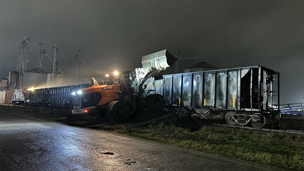 During the transition between the previous operator’s contract end-date and RER’s approved STB start-date, customer Rochester Iron and Metal, Grube’s family-owned business, faced a critical challenge: 20 railcars on-site with no means to load them. In response, RER obtained a track mobile and provided in-plant switching services. This effort culminated in the successful loading and staging of railcars for RER’s official launch. Concurrently, the RER Operations team prioritized immediate track repairs, acquiring a tie crane, scarifier, and ballast regulator, and renting a tamper. RER had to immediately install more than 120 ties, tamp the track, and replace broken joint bars to ensure safety.