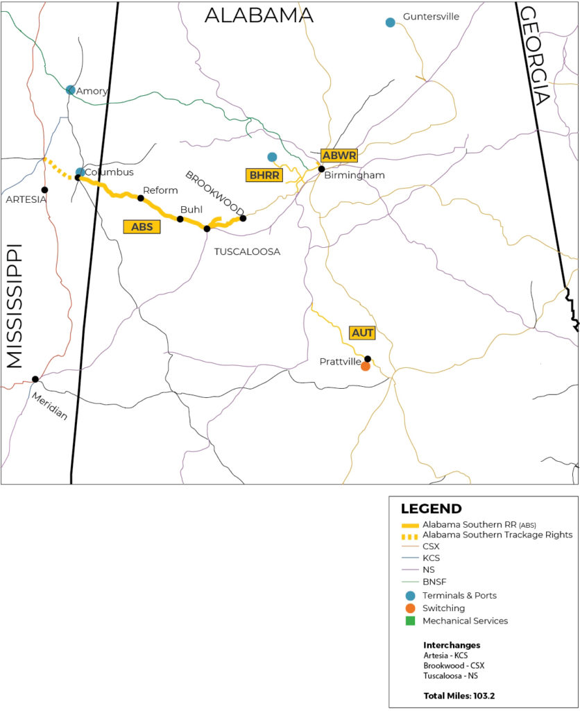 ABS’s primarily handles commodities for the energy, steel, paper, roofing, grain and chemical industries. It interchanges with Norfolk Southern in Tuscaloosa; CSX at Brookwood, Ala.; and Canadian Pacific Kansas City at Artesia, Miss.
