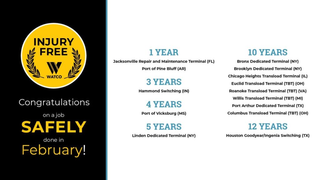 Fourteen Watco subsidiaries achieved safety anniversaries last month, the Pittsburg, Kans.-based supply chain services company reported via social media. See the list below.