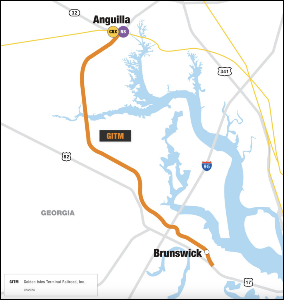 The rail-related grant—$26.5 million from the Federal Railroad Administration (FRA)—will help construct Phase II of the Colonel’s Island Rail Improvements project at the Port of Brunswick. GPA and G&W will provide a $27.6 million match. G&W is the parent company of Golden Isles Terminal Railroad, which serves the Colonel’s Island Terminal and interchanges with Norfolk Southern and CSX (see map, top).