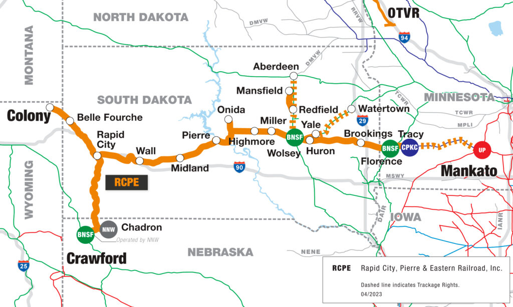 At more than 700 miles, RCPE stretches from Colony, Wyo., to Mankato, Minn., with branches from Rapid City, N.Dak., to Crawford, Neb., and from Wolsey to Aberdeen, S.Dak. The railroad offers customers access to the North American freight-rail network via interchanges with BNSF, Canadian Pacific Kansas City (CPKC) and Union Pacific (UP) railroads. Its commodity base includes agricultural products, aggregates and energy products.