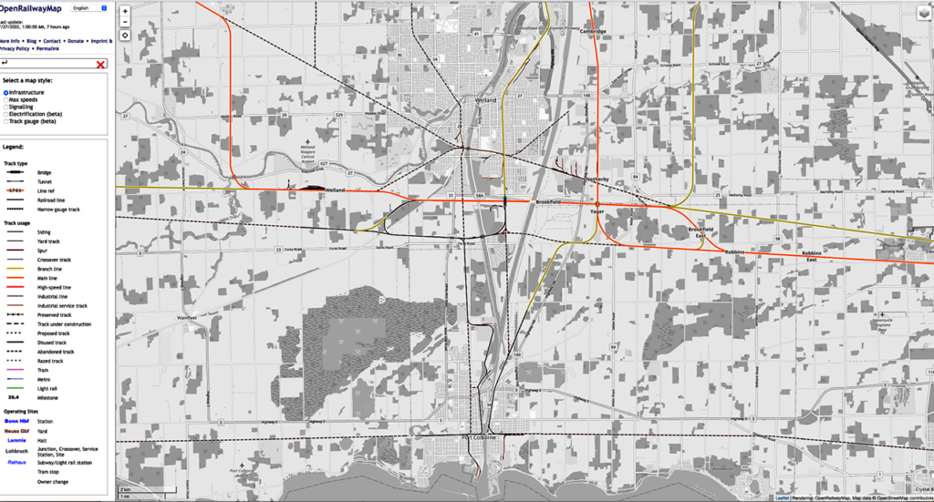 The Trillium Railway, a subsidiary of Gio Rail Holdings, is a Canadian short line operating in the Province of Ontario. Much of its right-of-way in the Niagara Region (below) was formerly part of the Welland Canal Railway (also known as the Welland Railway) that closely followed the route of the second Welland Canal. TRRY began operations in 1997 with only seven miles of track, all of which were located in Port Colborne. With an expansion in 1998, Trillium added 34 miles of track between Delhi and St. Thomas. Another expansion in 1999 added another 34 miles in Welland, Thorold and St. Catharines. In the Niagara Region, Trillium’s trackage, referred to as the Port Colborne Harbour Railway, is made up of former  CN secondary and branch lines, including a number of urban spurs, on the west side of the Canal. CN and Canadian Pacific interchange with TRRY at CN/CP Feeder. TRRY no longer operates on the south tracks of the Townline Tunnel under the Welland Canal. From July 2018 until the line’s closure in December 2021, TRRY operated the Orangeville Brampton Railway under contract from the Town of Orangeville, taking over operations from Cando Rail Services Ltd.