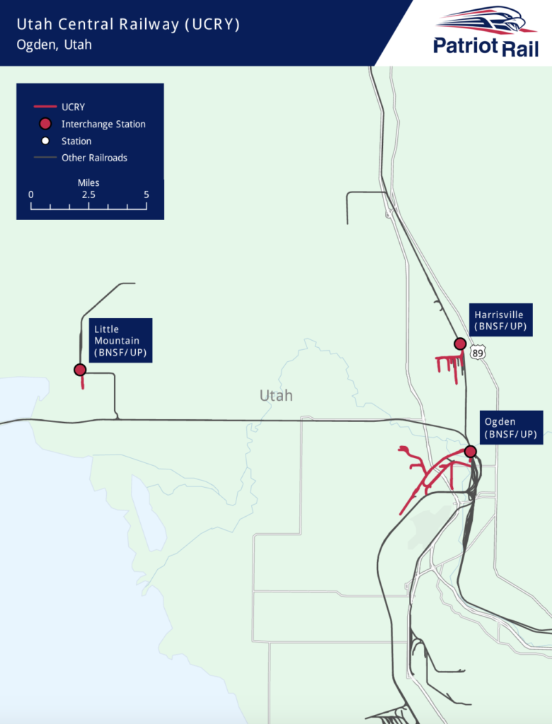 The 19-mile UCRY is the first of Patriot Rail’s 31 properties to be organized by the BLET. It interchanges with BNSF and Union Pacific at Harrisville, Ogden, and Little Mountain, Utah (see map, right), and hauls agricultural products, asphalt, biofuels (ethanol and biodiesel), chemicals, crude oil, feed grains, food ingredients, lumber, metal and steel products, lumber/wood products, LPG, petroleum products, plastic resin, sugar, and sweeteners.