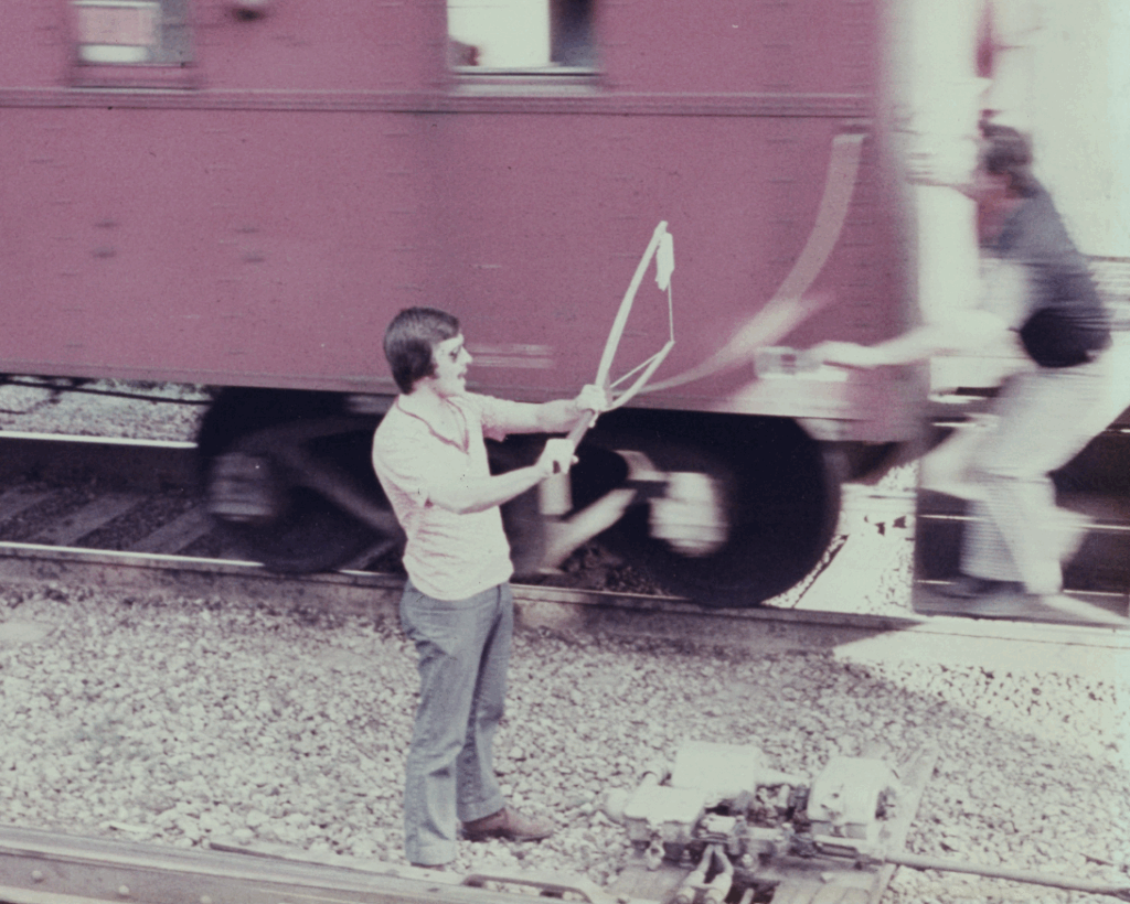 In this photo from early in his career, circa 1971, Vaughn hands up orders to a passing freight train. (Photograph and Caption Courtesy of ASLRRA)