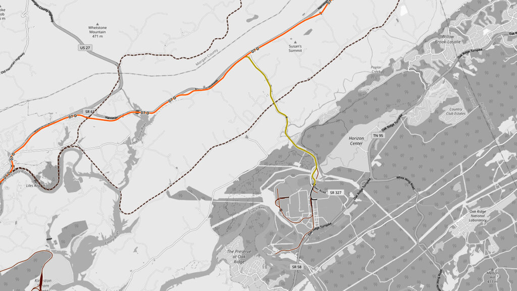 SMO map, in yellow; NS Knoxville District Oakdale Line, in orange. (Courtesy of OpenRailwayMap.org)