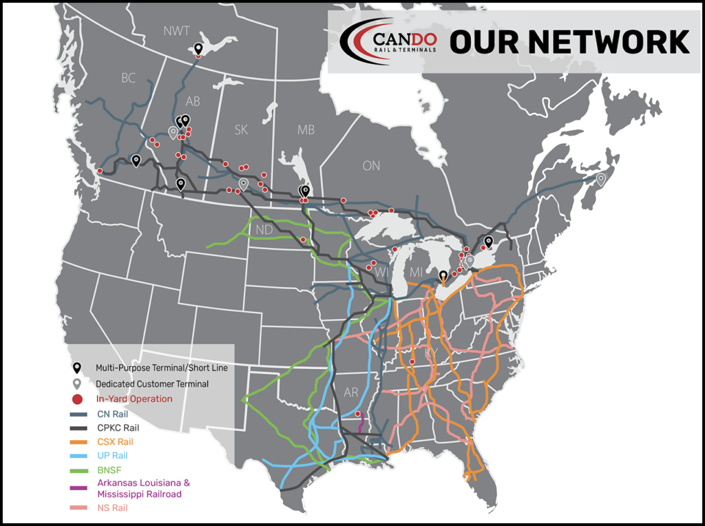 With this latest acquisition, Cando said its network has the capacity to stage and store more than 11,000 railcars. It now owns and operates 13 rail terminals and one short line (67-mile Central Manitoba Railway), in addition to providing rail operations at nearly 50 customer locations (see map below).