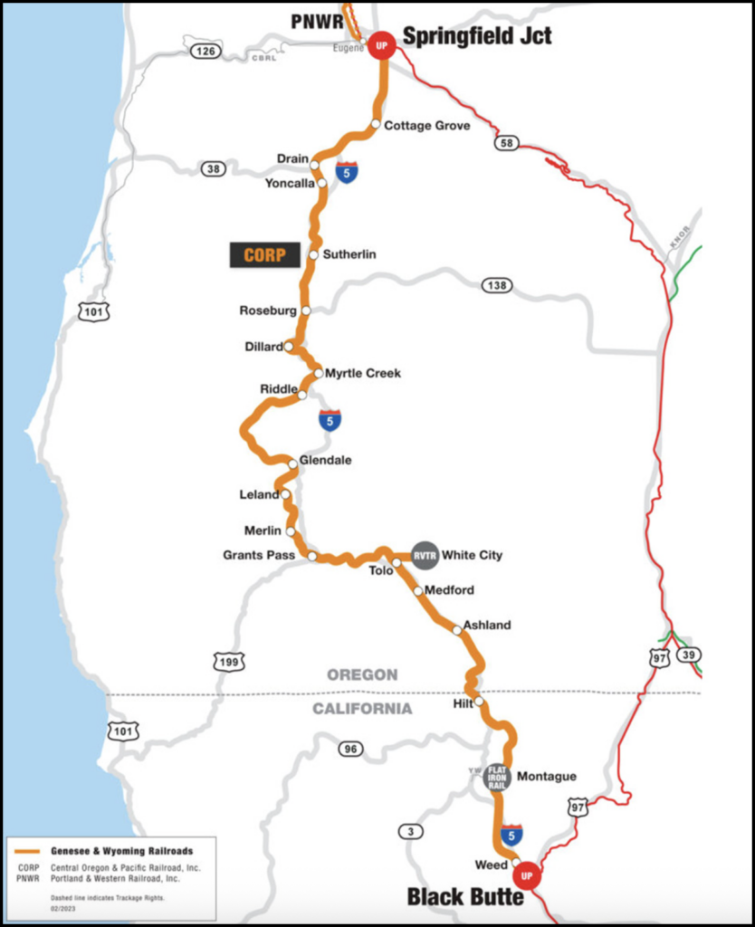 CORP operates along 306 track miles in Oregon (248) and California (58), interchanging with Flat Iron Rail in Montague, Calif.; Rogue Valley Terminal Railroad in White City, Ore.; and Union Pacific in Eugene, Ore., and Black Butte, Calif. (see map below).