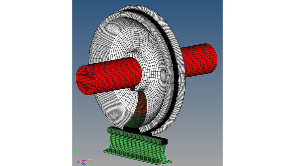 To help mitigate these undesirable outcomes and support development of improved materials, detailed computer models of wheel/rail contact can help our understanding of fatigue defects in wheels and rails. Figure 3 (below) is a rendering of such a model.