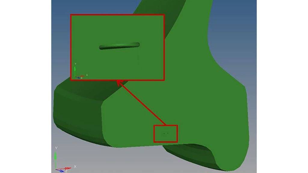 While not immediately apparent, this model includes a small, penny-shaped fatigue defect that the model predicted forming at a highly stressed location in the wheel rim. Figure 4 (below) shows a close-up view of the location of the defect.