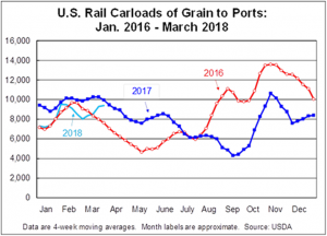 The statement by AAR added that Mexico is the second-largest importer of corn, and about 30-35% of shipments cross the border on Kansas City Southern Railway trains. China now purchases 62% of soy exports and 22% of sorghum exports, according to the U.S. Department of Agriculture, and that those products bound for China first make their way to U.S. ports via rail. Recent USDA data indicates that rail carloads of grain to ports have been slightly lagging compared to 2017.