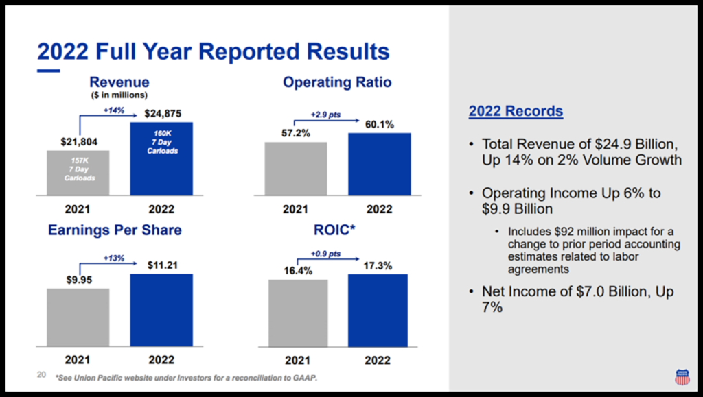Take a look at UP’s 2022 results. For full-year 2022, the railroad reported operating revenue of $24.9 billion, an increase of 14% over 2021 “driven by higher fuel surcharge revenue, core pricing gains and volume growth.” Business volumes grew 2%. The railroad said its 60.1% reported operating ratio deteriorated 290 basis points from 2021. “Higher fuel prices negatively impacted the operating ratio by 20 basis points and the prior period adjustment related to new labor agreements added 30 basis points to [the] operating ratio.” Operating income for 2022 came in at $9.9 billion, a 6% rise over 2021.