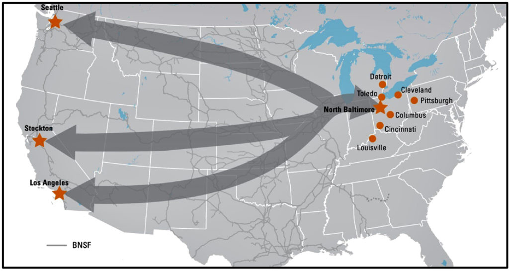 About a decade ago, a large all-new hub-and-spoke CSX terminal built at New Baltimore, Ohio (south of Toledo) didn’t pan out as expected. But that business outcome had an unexpected upside. What might be characterized as a CSX intermodal stumble became perhaps a BNSF win. BNSF negotiated a deal whereby today, this CSX Ohio location looks like a forward BNSF Logistics Park far to the east of BNSF’s normal Chicago operating territory. Under a freely negotiated arrangement, CSX earns revenue by hauling BNSF intermodal trains between the Chicago terminal and northwestern Ohio under a special haulage agreement. So in October 2018, BNSF extended its direct West Coast intermodal service east as far as western Ohio. It’s five days a week., two trains per day in each direction. CSX also earns a rental use income from the “sunk cost” intermodal yard it built. Who saw that outcome back around 2012?