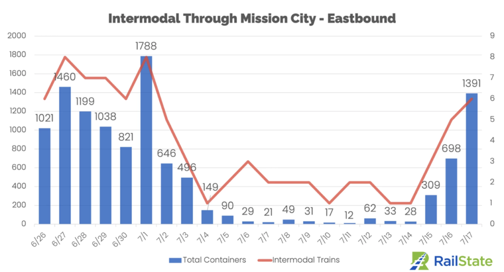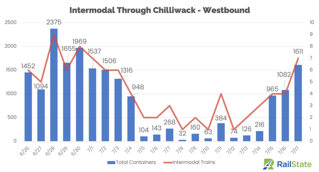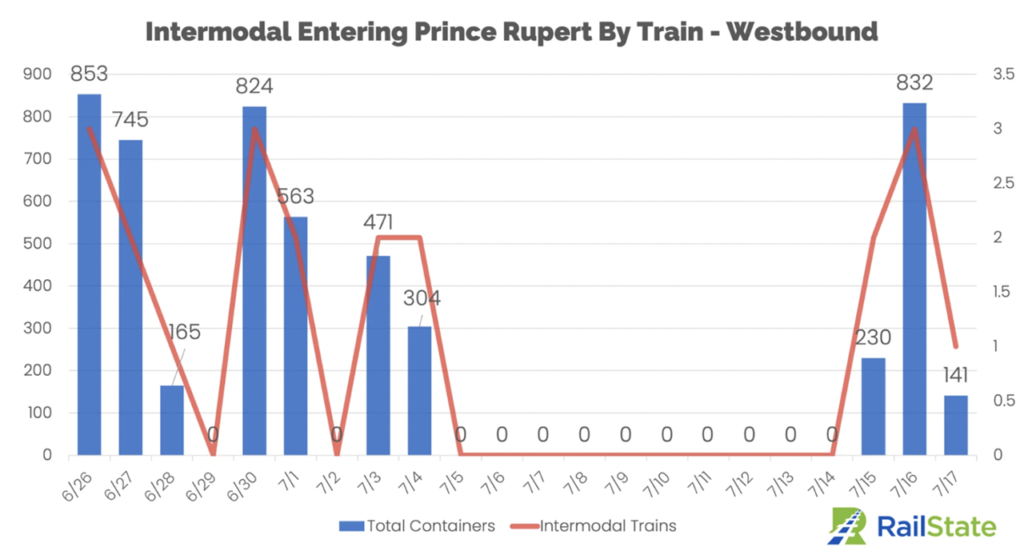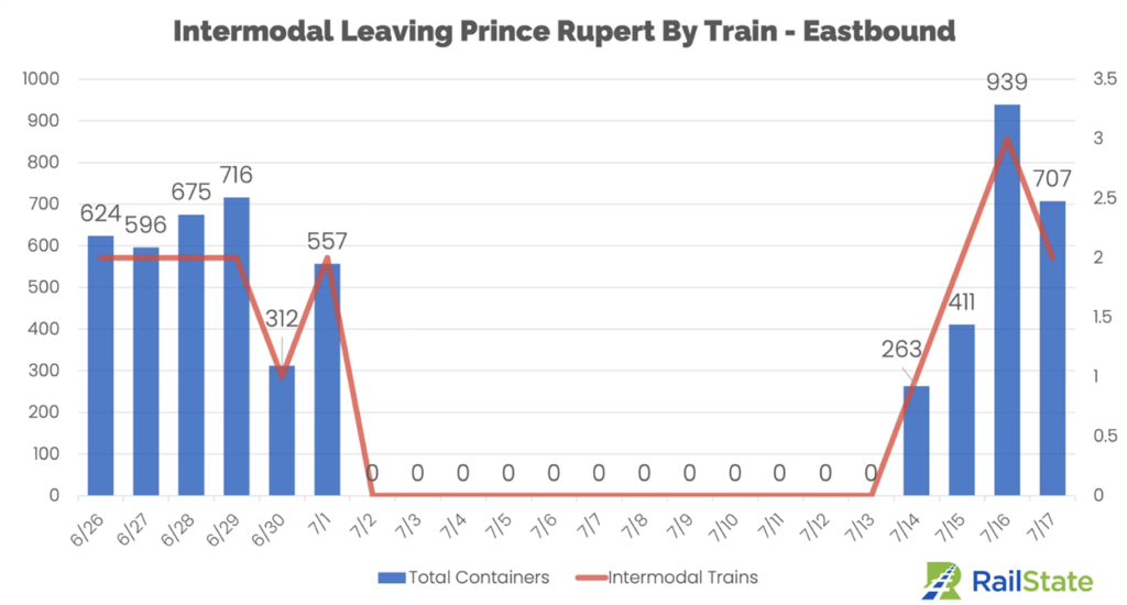 “On the 14th, one intermodal train left Prince Rupert headed eastbound carrying 263 containers. On Saturday, the 15th, two trains carried 411 containers eastbound, on Sunday, July 16th, that jumped to three trains carrying 939 containers, and Monday, July 17th saw 2 trains and 707 containers moving eastbound.