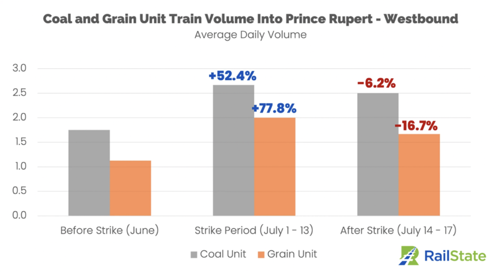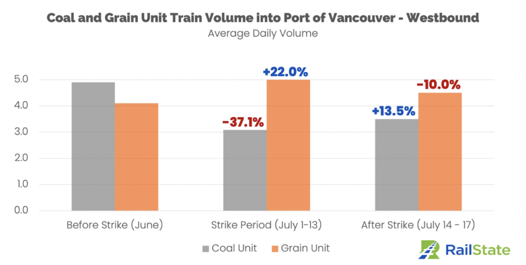 “Coal moving through the Port of Vancouver slowed significantly during the strike, dropping 37.1%. With the strike shutting down exports through Neptune Bulk Terminals in Vancouver, some shippers shifted to Prince Rupert. Westshore Terminals in Vancouver continued to operate so some coal continued to move through Vancouver. After the end of the strike, coal unit train volume is starting to increase through the Port of Vancouver.