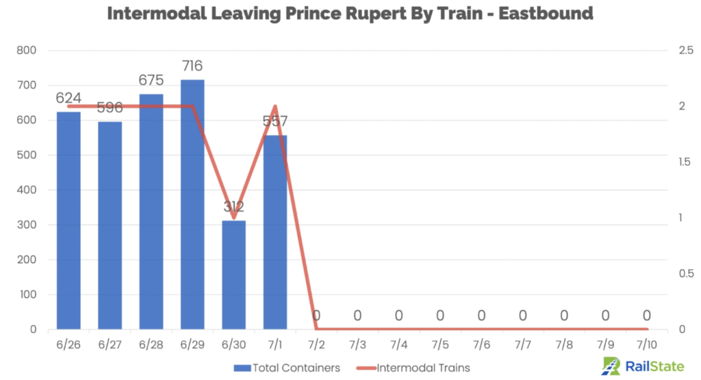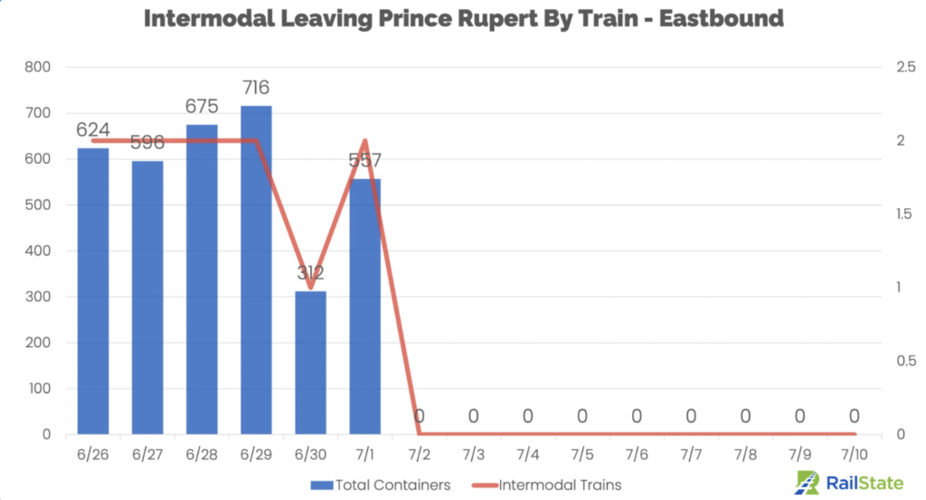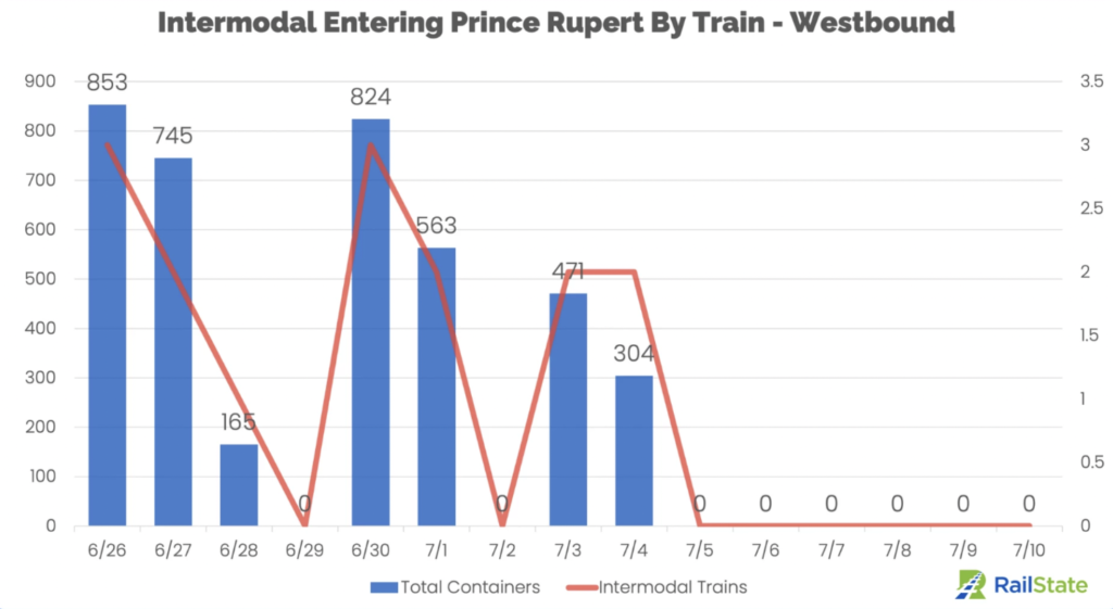 “Intermodal rail traffic eastbound out of Prince Rupert completely halted once loaded trains exited on the first day of the strike.