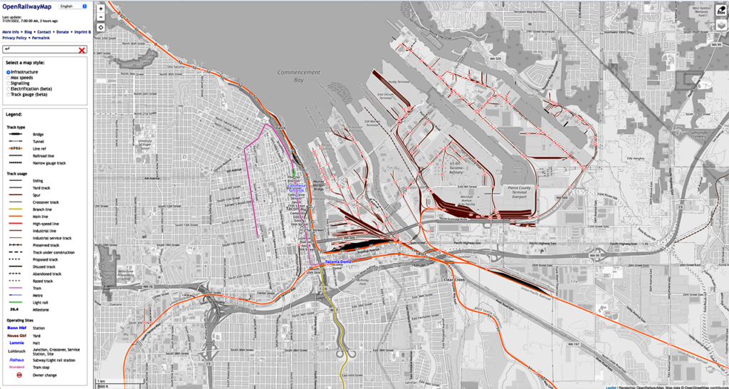 Tacoma’s port and rail network. OpenRailwayMap.org