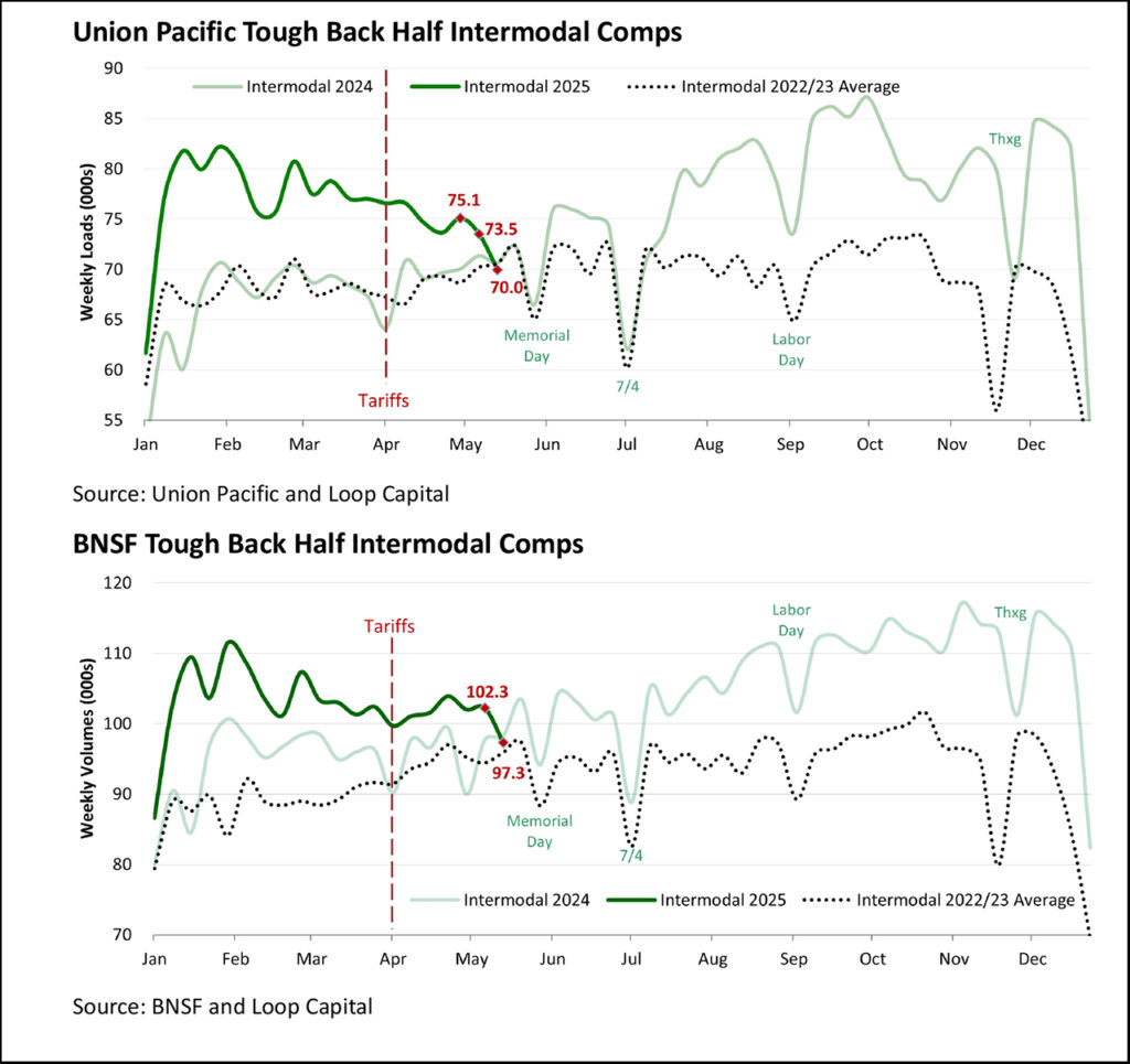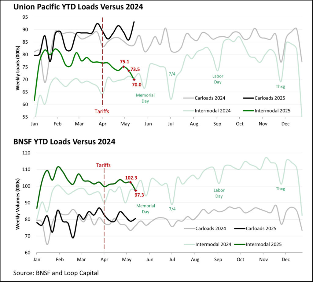 The same chart for BNSF shows the China effect only really visible in the past reported week, ending May 17 (so a five-week lag from the 145% announcement), when total loads fell from 102,000 to 97,000 loads. We’ll be dealing with the China air pocket for another two or three weeks in data terms, after which we’ll see a “relief rally” in import volumes, reflecting the de-escalation in the U.S. tariff from 145% to 30% announced May 12.