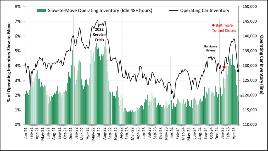 In the week ending May 16, CSX finally returned operating car inventory to levels consistent with where it was prior to the Howard Street Tunnel closure on Feb. 1, and the proportion of these cars that were slow-to-move also saw another nice sequentially drop, from 1.9% to 1.5%, a 10-month low.