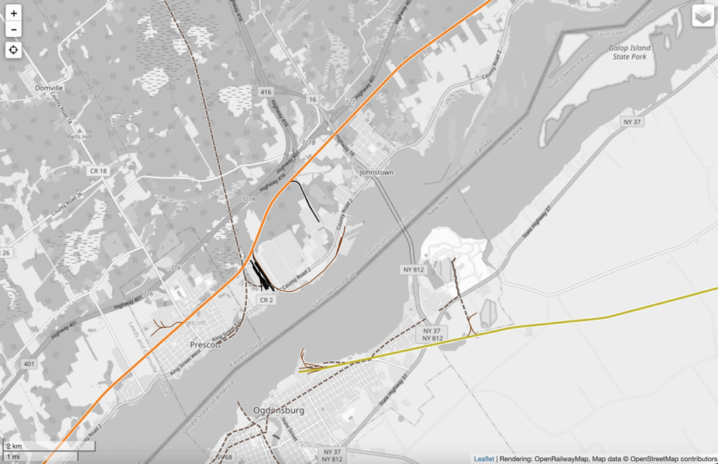 The Port of Johnstown is on the St. Lawrence Seaway (see map above). Its spur line connects shippers to CN’s double-tracked main line along the Windsor–Quebec City corridor, and through interchange agreements provides service to Canadian Pacific Kansas City. The Port is also near the junction of several major roadways, including the 401 linking to Montreal and Toronto and the 416 linking to Ottawa; these arteries intersect within 1.2 miles (2 kilometers) of the Port and connect to the Prescott-Ogdensburg bridge to the United States. Country Road No. 2 provides access to neighboring Seaway towns, such as Prescott, Cardinal and Brockville.