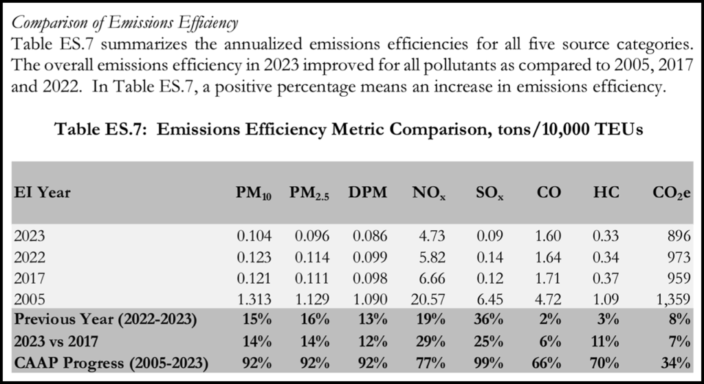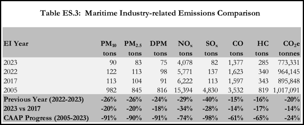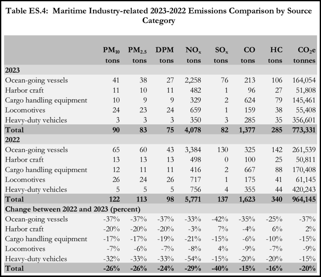 For the first time, the Port said, the annual inventory also shows clean air progress made since the most recent CAAP update. From 2017 to 2023, Port measures have cut DPM, NOx, SOx, and GHG emissions 18%, 34%, 28%, and 14% respectively, it noted.