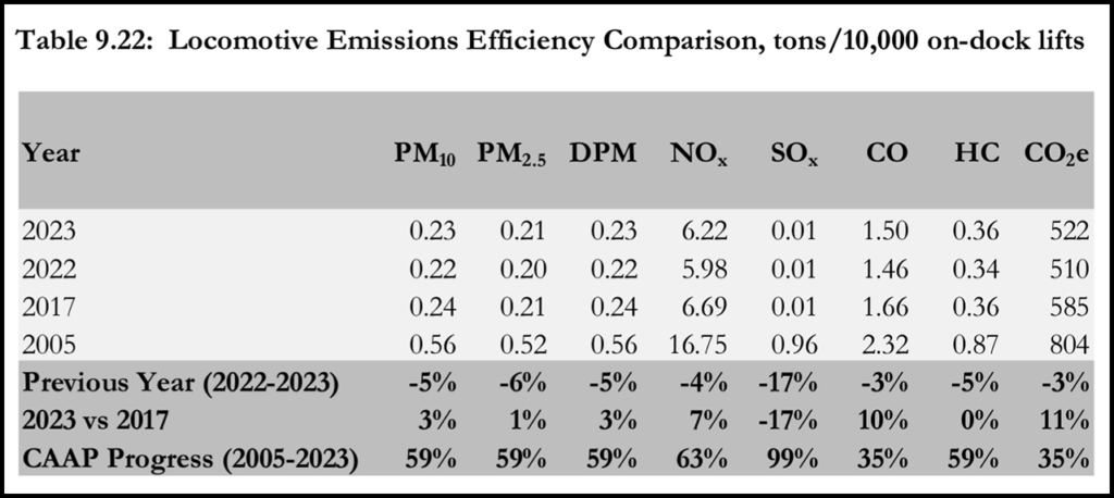 Table 9.22 (below) shows the locomotive emissions efficiency changes in 2023 from the previous year, 2017, and 2005, according to the Port of Los Angeles, which noted that a positive percentage for the emissions efficiency comparison indicates an improvement in efficiency. For locomotive emissions efficiency, the on-dock lifts were used as opposed to TEU throughput, the Port said, since this is a more direct way to measure efficiency for the locomotives. For the CAAP progress (2023 vs. 2005) and comparison to 2017 (2023 vs. 2017), emissions efficiencies have improved for all pollutants.
