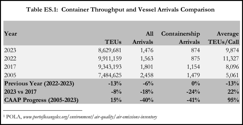 In 2023, container volume at the Port was down 13% from 2022 (see Table ES.1 below). “To ensure the Port’s clean air gains are not tied to cargo fluctuations, the Port also calculates the reduction in tons of emissions by twenty-foot equivalent unit (TEU), the standard unit of measure for international shipping containers,” according to the Port of Los Angeles. “Based on tons of emissions per 10,000 TEUs, the 2023 results not only substantiate the Port’s clean air gains but show slightly better results. Emissions of DPM, NOx and SOx [are] down 92%, 77% and 99% respectively since 2005” (see Table ES.7 below).