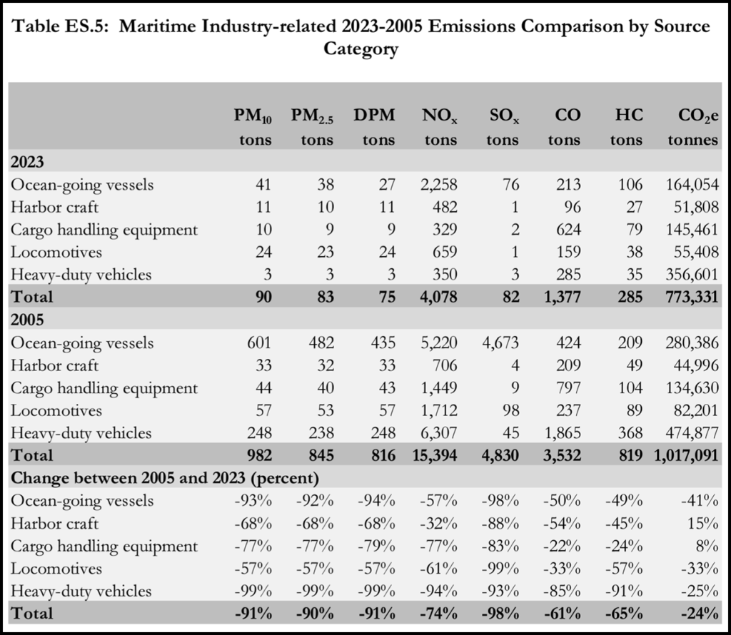 The 2023 findings, vetted by regional, state and federal air regulatory agencies, show diesel particulate matter (DPM), nitrogen oxides (NOx) and sulfur oxides (SOx) from ships, trains (the Port is served by Union Pacific/UP, BNSF and the Pacific Harbor Line/PHL, an Anacostia Rail Holdings subsidiary), trucks, harbor craft, and off-road terminal equipment are down 91%, 74% and 98% respectively since 2005 (see Table ES.5 below). Since last year’s inventory, DPM, NOx, and SOx fell 24%, 29%, and 40% (see Table ES.3 below)