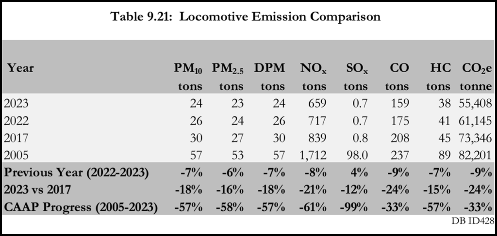 Table 9.21 (below) shows the locomotive emission estimates for calendar years 2023, 2022, 2017, and 2005: