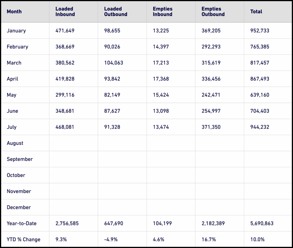 The Port has moved 5,690,863 TEUs through the first seven months of this year, up 10% from the prior-year period.