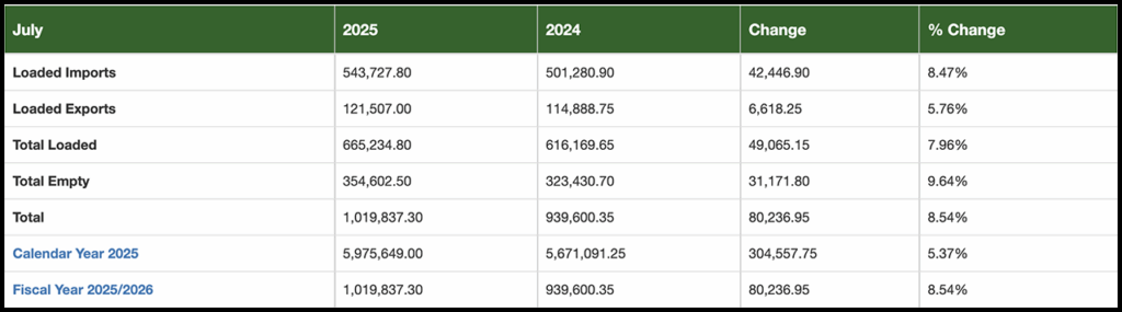 The TEUS processed by dockworkers and terminal operators in July were up 7% from the previous record set in July 2024. Imports rose 7.6% to 468,081 TEUs and exports declined 12.9% to 91,328 TEUs. Empty containers moving through the Port increased 12.3% to 384,824 TEUs.