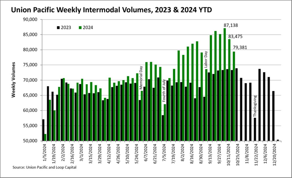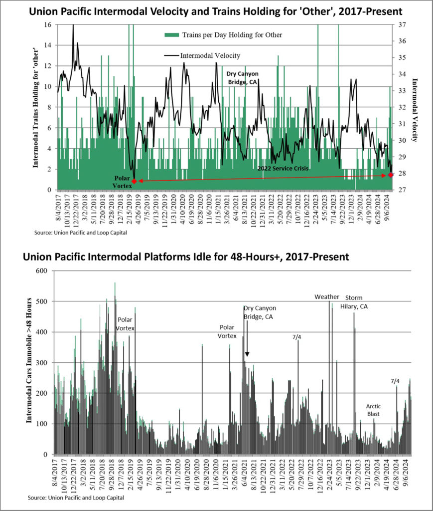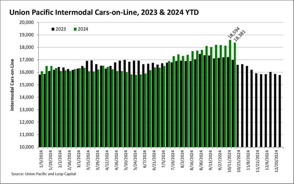 Another useful measure is to count the number of intermodal platforms that were idle for 48 hours or more in any given week, as spikes can indicate congestion. Does that also show a top in the week ending Oct. 11 and a modest improvement off that high in the following week? Yes it does, with idle platforms hitting 248 in the week ending Oct. 11, representing a high not seen since Tropical Storm Hilary took out a bridge on UP’s Sunset Corridor in August 2023, before a small improvement to 189 the following week.