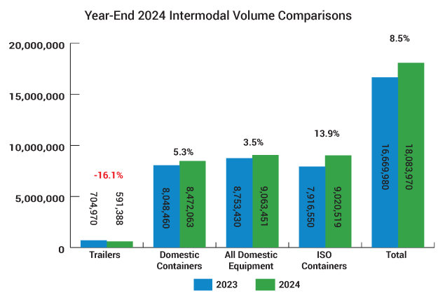 Total intermodal volume gained 7.5% year-over-year in the fourth quarter of 2024, according to the Intermodal Association of North America’s (IANA) latest report. While trailers dropped 6.2%, domestic container and international container originations grew 6.5% and 9.6%, respectively. For the year, total volume rose 8.5%.