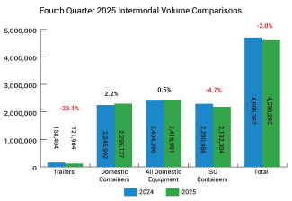 Total intermodal volume fell 2.0% year-over-year in fourth-quarter 2025, the Intermodal Association of North America (IANA) reported Feb. 16. While domestic container originations grew 2.2%, international containers declined 4.7%, and trailers dropped 23.1%. For the year, total volume rose 2.3%.