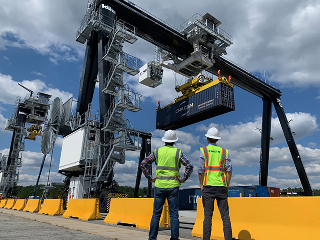Six fully electric cranes power the stacking operation at Norfolk Southern’s Austell Intermodal Terminal, and lower carbon emissions in the process. These cranes, the first of their kind in North America, represent a significant step toward reducing environmental impact and increasing operational efficiency. NS photo.