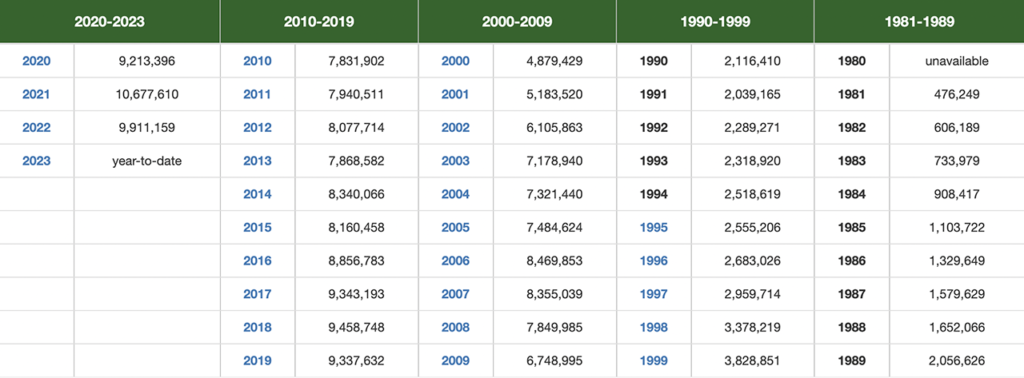 The Port of Los Angeles on April 12 reported handling 1,837,094 TEUs (twenty-foot equivalent units) for the first three months of 2023, falling 32% from the same period last year, which it said was the best first quarter in the Port’s history.