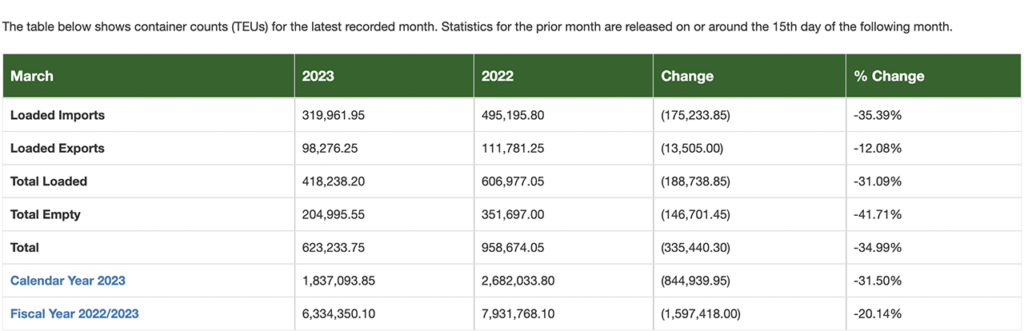 It processed 623,234 TEUs in March. Loaded imports reached 319,962 TEUs, down 35% from March 2022, and loaded exports came in at 98,276 TEUs, a 12% drop from last year. Empty containers landed at 204,996 TEUs, a 42% year-over-year decline.