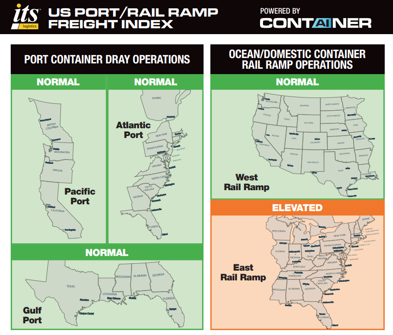 These findings are part of the Nevada-based third-party logistics (3PL) firm’s US Port/Rail Ramp Freight Index for May. Each month, ITS Logistics releases an index forecasting port container and dray operations for the Pacific, Atlantic and Gulf regions. Ocean and domestic container rail ramp operations are also highlighted in the index for both the West and East inland regions.