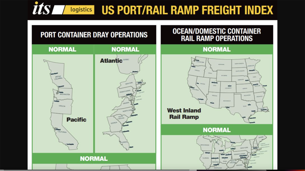 The findings come from the December edition of the ITS Logistics US Port/Rail Ramp Freight Index. The Nevada-based third-party logistics (3PL) firm releases the index each month, forecasting port container and dray operations for the Pacific, Atlantic and Gulf regions. Ocean and domestic container rail ramp operations are also highlighted in the index for both the West Inland and East Inland regions.