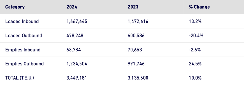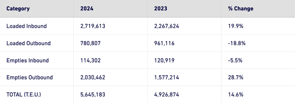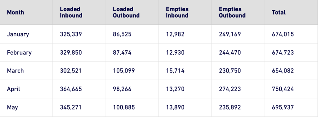 Through the first five months of 2024, the Port noted that it has moved 3,449,181 TEUs, and is still up 10% from the same period in 2023.