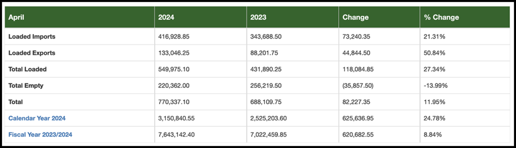 April 2024 loaded imports came in at 416,929 TEUs, up 21% from the prior-year period, and loaded exports reached 133,046 TEUs, up 51% compared with last year. April marked the 11th consecutive month of year-over-year export gains, according to the port. Additionally, 220,262 empty containers were processed in April, down 14% from 2023.