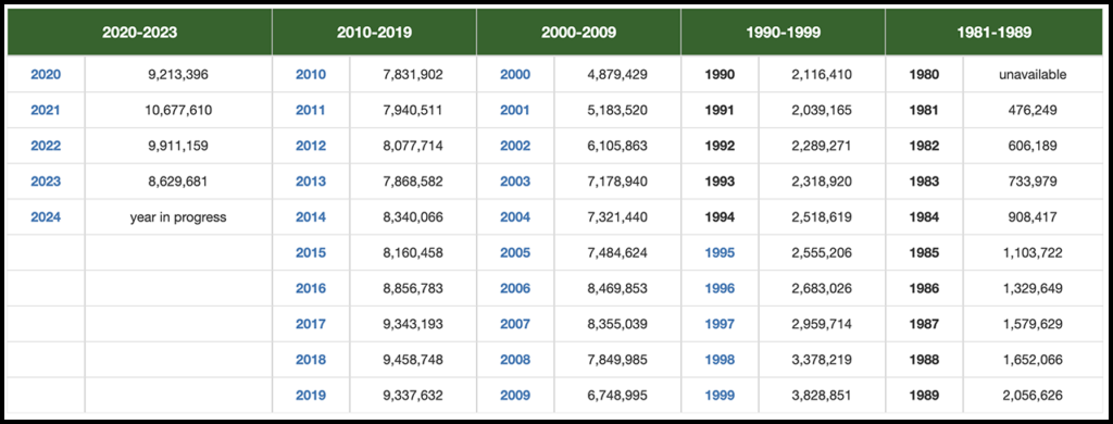 Annual Container Statistics (Container counts/TEUs for years 1981-1994 are provided in calendar year totals only; monthly breakdowns prior to calendar year 1995 are unavailable.) (Caption and Table Courtesy of Port of Los Angeles)