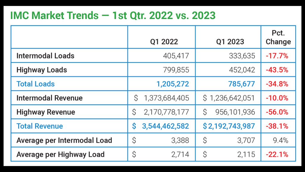 “The seven highest-density trade corridors, which collectively handled more than 60% of total volume, were all down in the first quarter,” IANA noted. The highest was the South Central-Southwest, with a 19.2% deficit, followed by the Southeast-Southwest at 16.0%. The Midwest-Southwest declined 9.2%; Midwest-Northwest 7.8%, and the Northeast-Midwest 7.8%. The Intra-Southeast came in 5.4% lower, while the Trans-Canada corridor held losses to 1.2%.Total IMC (intermodal marketing company) volume fell 34.8% year-over-year in 1Q23, with intermodal traffic down 17.7% and highway loads down 43.5%.