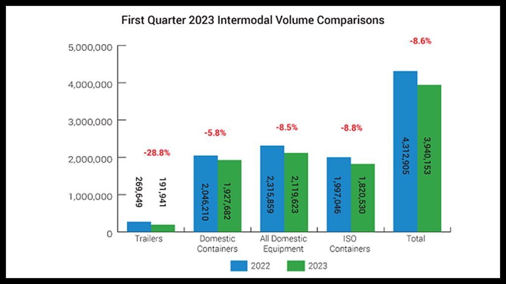 “Total intermodal volume contracted by 8.6% in the first quarter of 2023 compared to the first quarter in 2022. It was the seventh straight drop in quarterly output as well as the second largest decline of the seven. Just over 3.9 million intermodal moves were counted in the quarter vs. fourth quarter 2022 loadings of over 4.2 million.