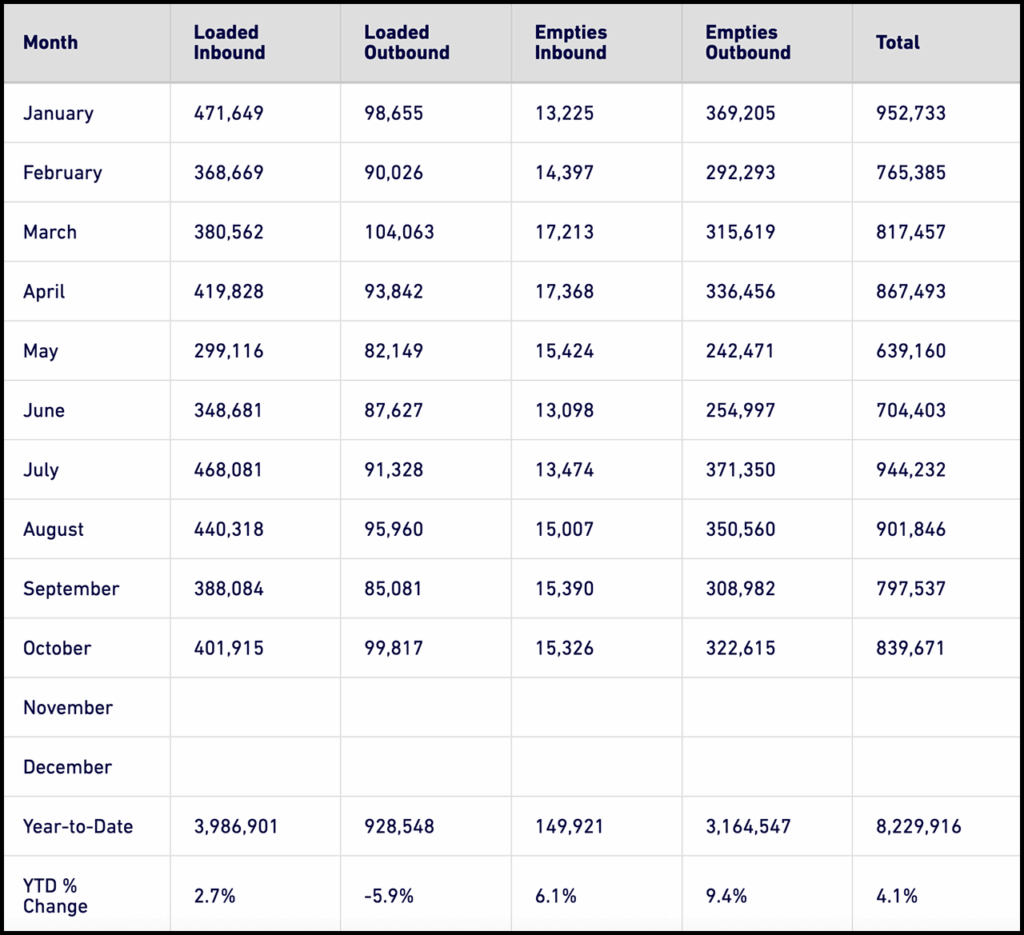 In October 2025, dockworkers and terminal operators moved 839,671 TEUs, down 14.9% from October 2024, which the Port said remains the busiest month in its 114-year history. Imports decreased 17.6% to 401,915 TEUs; exports decreased 11.5% to 99,817 TEUs; and empty containers moving through the Port declined 12.6% to 337,940 TEUs vs. the same month last year.
