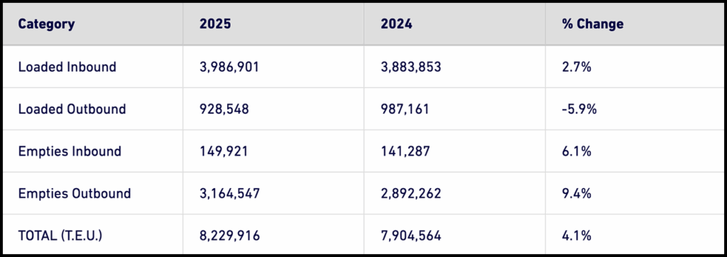 The Port said it moved 8,229,916 TEUs (Twenty-Foot Equivalent Units) through the first 10 months of 2025, up 4.1% from the same period last year.