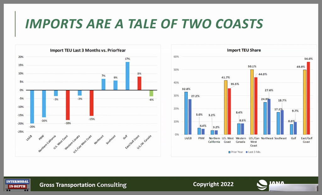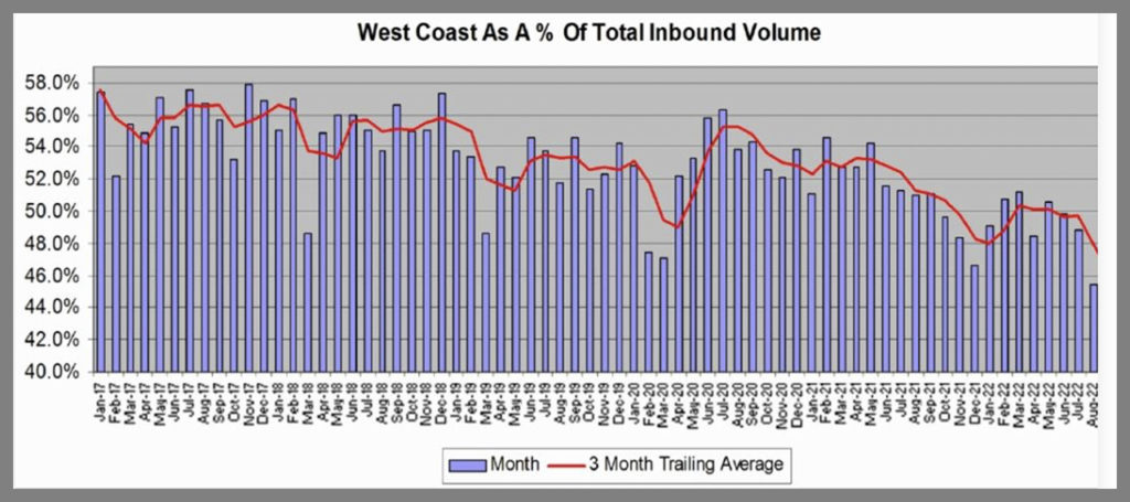 “This inbound receipt/distribution pattern is an insurance policy that offsets the disruption seen in LA/Long Beach throughout most of 2022. The impact on the U.S. railroads is a lower volume of containers to move between the West Coast ports and the Chicago/Memphis gateways and then further east. This is affecting Union Pacific and BNSF. Norfolk Southern and CSX might pick up some intermodal container movements between the Atlantic ports and the Ohio Valley/Chicago area. The shifting stack train pattern is not yet fully understood and too early to really measure. Bear in mind, also, that shorter-haul intermodal movements from the East inland are less profitable for railroads than long-distance moves like LA to Chicago.”