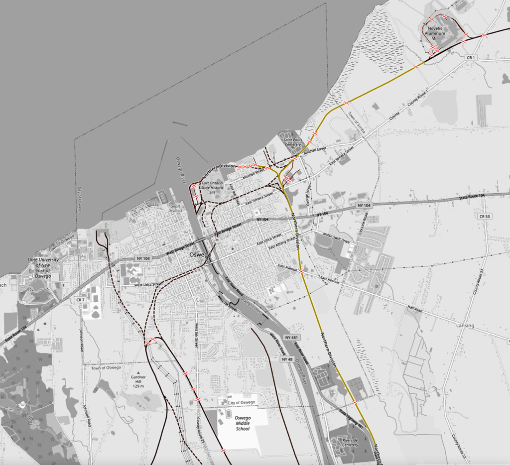 Closeup of Port of Oswego rail facilities. (Image Courtesy of OpenRailwayMap.org)