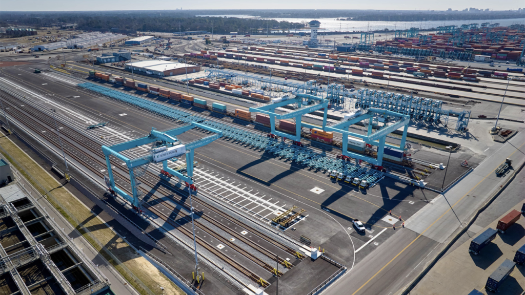 Construction on the central rail yard expansion began in 2022, and the project was delivered “on-time and on-budget,” according to The Port of Virginia. The port used a $20 million Port Infrastructure Development Grant from the U.S. Department of Transportation and a $20 million grant from the state Department of Rail and Public Transportation to build two new track bundles and purchase three all-electric cantilever rail-mounted gantry cranes.