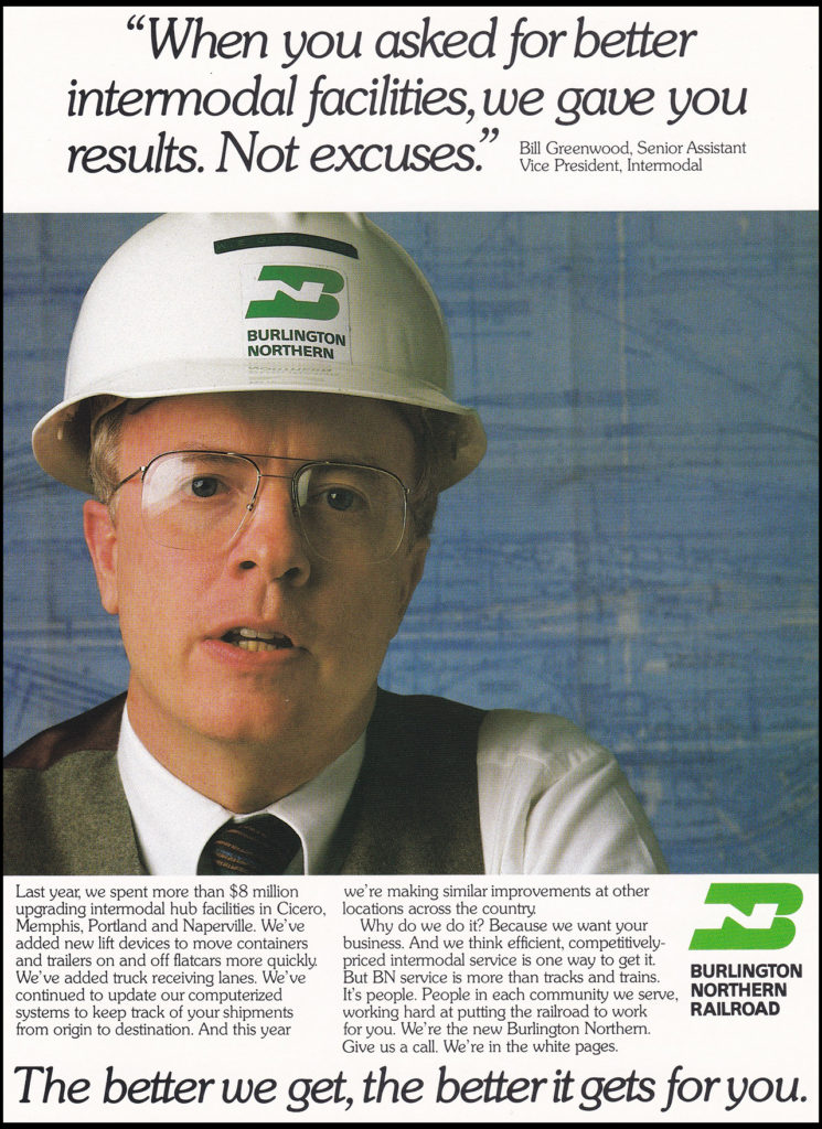 - Use of extensive market research to create customer service packages that would equip BN to offer what it could profitably sell instead of trying to sell what it offered, as the industry had done historically. As such, Greenwood’s BN Intermodal led the industry in the conversion from a traditional “traffic”/business solicitation orientation to implementation of true marketing.