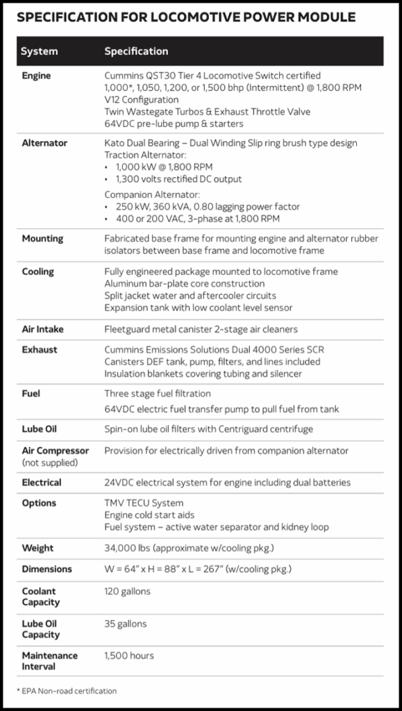 The power module upgrades switcher locomotives to Tier 4 compliance, according to the manufacturer. Designed for 1,000-h.p. to 1,500-h.p. repowers, it is said to deliver “greater fuel efficiency and reliability.”